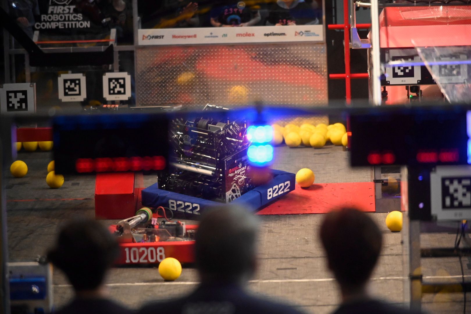 Team 8222 competed at The Buckeye Regional, hosted at the Cleveland State University Wolstein Center this past March. Rebuilt, the name and theme of this year’s game, challenged all teams to build a 115lbs industrial sized robot to be able to project multiple 5.9″ diameter balls called fuel and hand from a tower of up to 5′ tall. The Argonauts accepted the challenge and answered the call with their robot named Dale. The machine is a short robot with a maximum height of 30″ and can hold up to 52 fuel in its extendable hopper. With its black, silver and blue color scheme, it is a mighty machine that can take a hit and score fuel.